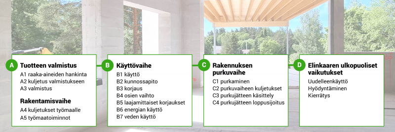 Rakennukselle tavoitellaan mahdollisimman pitkää elinkaarta ja siksi rakennuksen käytön aikaisella energiankulutuksella on merkittävä osuus hiilipäästöjen osalta. Tehtyjen suunnitteluratkaisujen (mm. lämmitysmuoto, energiatehokkaat rakenteet) lisäksi, käytön aikana oleellista on huolehtia teknisten järjestelmien ja rakennuksen huollosta ja korjauksista ajoillaan.
