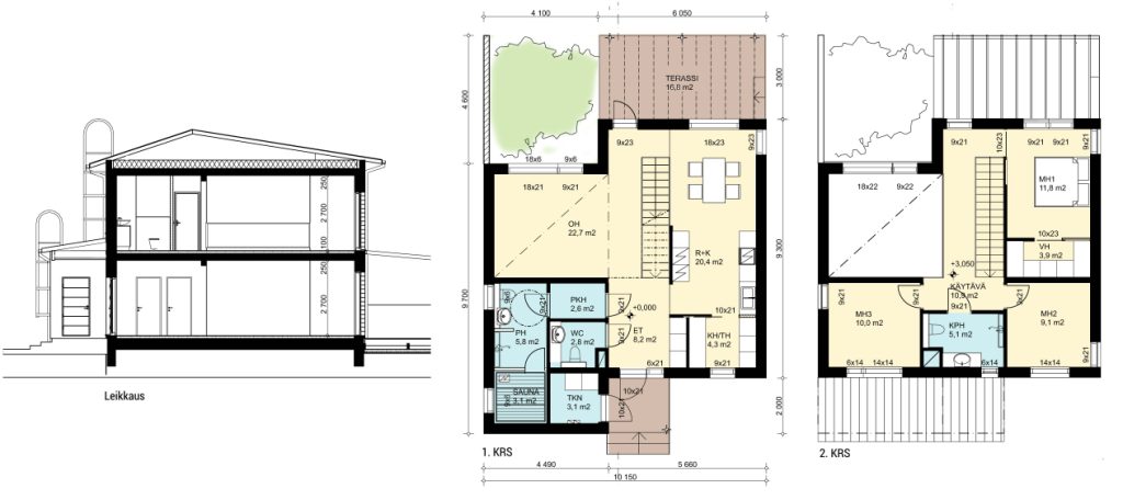 - Perusratkaisu kuvaa tyypillistä rakennuslupavaiheen ratkaisuvaihtoehtoa. Jämerän vakiorakenteiden (tässä tapauksessa ulkoseinä 375 mm harkko) lisäksi rakennuksen ilmatiiveys on laskentavaiheessa 2 m3/m2h ja tekniset ratkaisut perustason ratkaisuja. Energialuokka on B.
