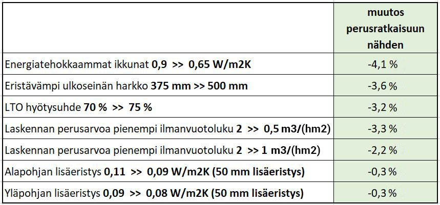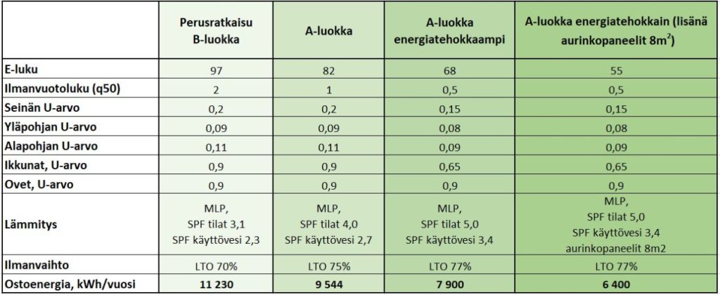 - A-luokan energiatehokkaimmassa ratkaisussa lisänä on 8 m2 aurinkopaneeleja. Lopputuloksena on pientalo, jonka ostoenergiankulutus on 57% perusratkaisusta.