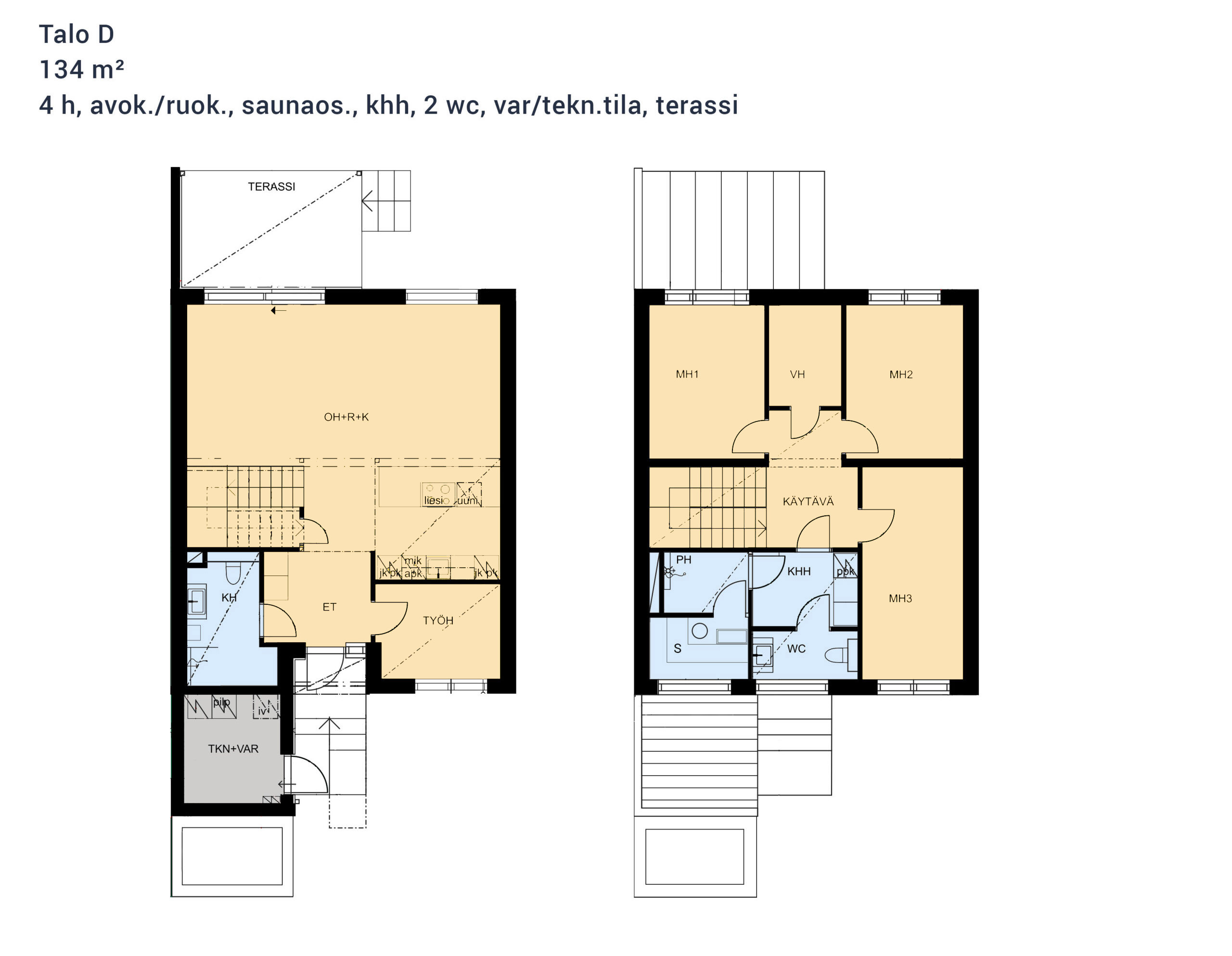 4 h, avok./ruok., saunaos., khh, 2 wc, var/tekn.tila, terassi
