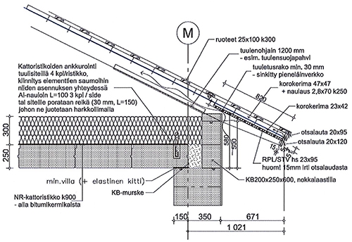 Yläpohjassa ilmatiiviys saavutetaan täyttämällä elementtien välisissä saumoissa ja päädyissä olevat juotosurat juotoslaastilla, asentamalla elementin ja seinän väliseen liitoskohtaan mineraalivillakaista sekä tiivistämällä seinän ja katon välinen nurkka elastisella tiivistysmassalla (ks. kuva 4). Hyvä ilmatiiviys varmistetaan lisäksi elementtien sisäpintaan laitettavalla tasoitteella.