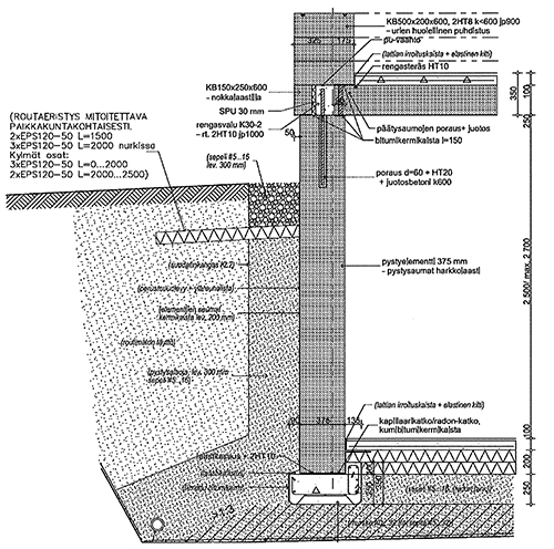 Maanvastaiset ulkoseinät tehdään joko kevytbetonielementeistä tai vaihtoehtoisesti kevytsoraharkoista, joiden ulkopintaan laitetaan perusmuurilevy. Kevytbetonielementeissä saumojen kohdalle ulkopintaan laitetaan lisäksi bitumikermikaistat (kuva 5). Kevytsoraharkkorakenteessa ulkopinta tasoitetaan ennen perusmuurilevyn laittaa. Tässä tapauksessa rakenteen ulkopuolelle laitetaan vielä erillinen solumuovilämmöneriste. Perusmuurilevy estää maasta tulevan kosteuden tunkeutuminen rakenteisiin ja sallii kosteuden poistumisen rakenteesta. Sisäpinta tehdään vastaavalla tavalla kuin ulkoseinissä, jolloin se mahdollistaa lämpö- ja kosteusolosuhteiden tasaamisen.