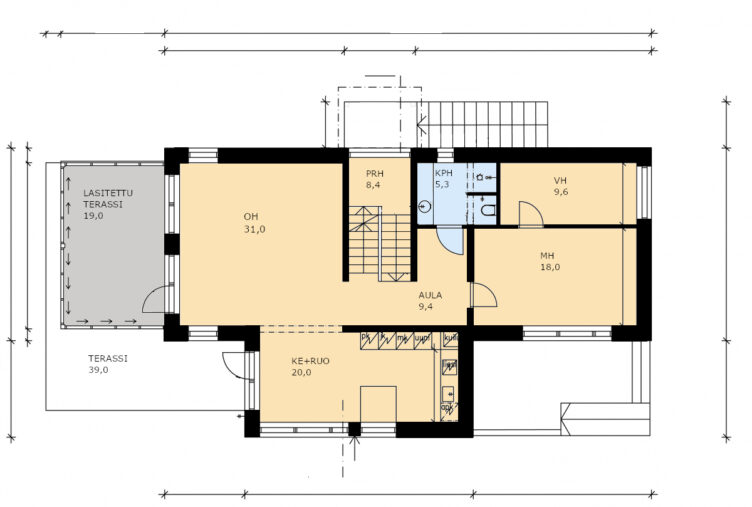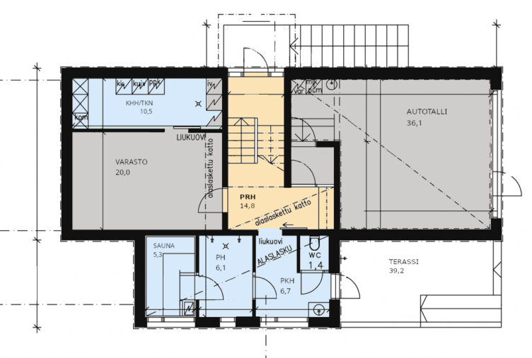 Yläkerran makuuhuoneet ja aulatila tarjoavat rauhaa ja toimivuutta, ja parveke tuo yhteyden ulkoilmaan. Alakerrassa sijaitsevat saunaosasto, kodinhoitotilat sekä runsaasti säilytystilaa, ja autokatos suojaa ajoneuvoja.