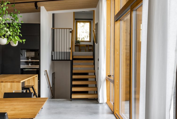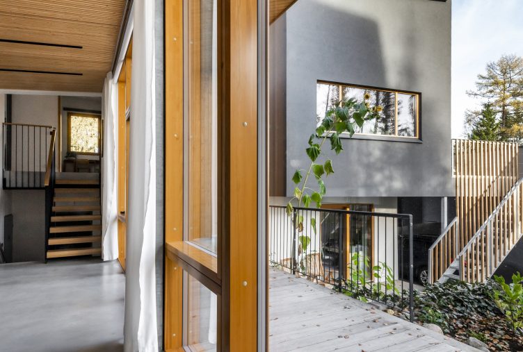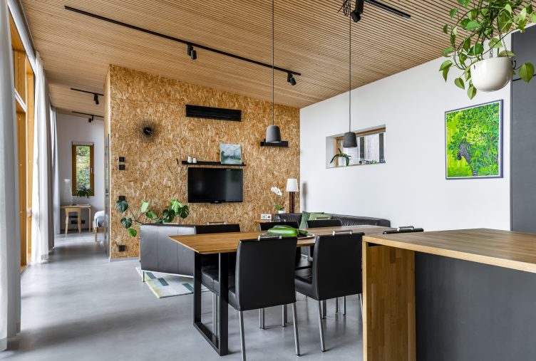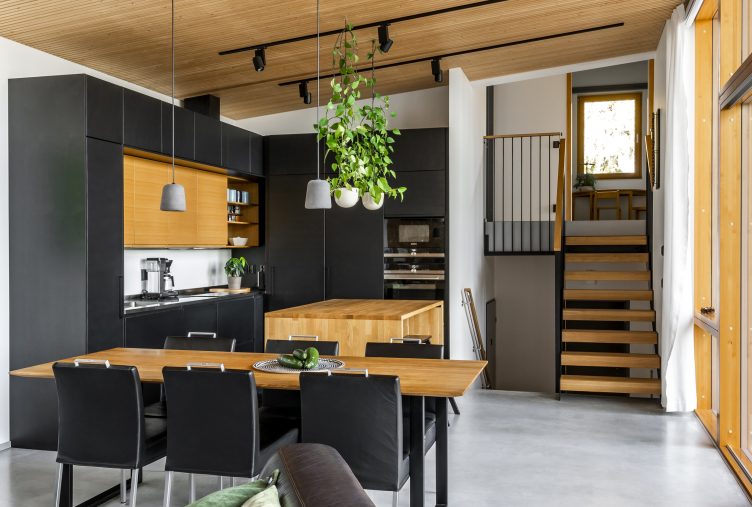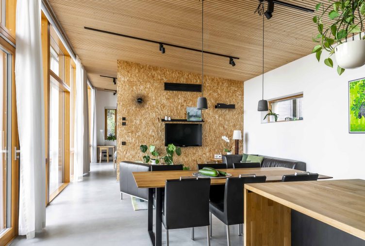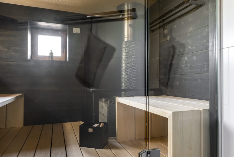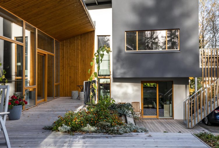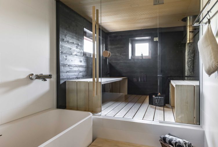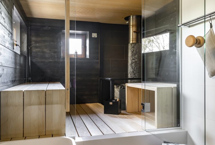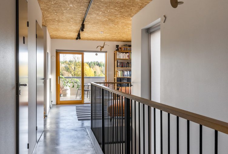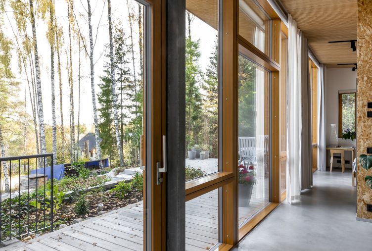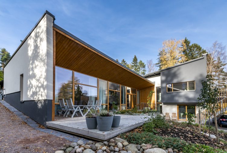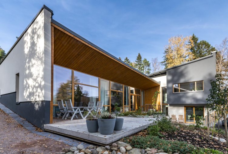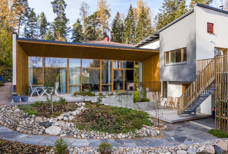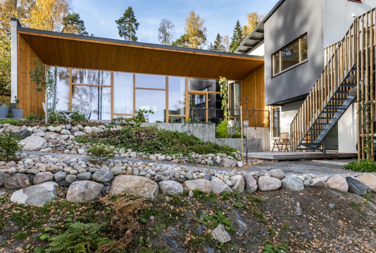 Sisätiloissa puun käyttö tuo lämpöä ja luo luonnollisen tunnelman, joka tasapainottaa muuten modernia ilmettä. Avara oleskelu- ja ruokailutila on suunniteltu perheen ja ystävien yhteisiä hetkiä varten, ja suuri terassi tuo ulkotilat osaksi arkea. Makuuhuoneet ja yksityisemmät tilat on sijoitettu harkiten, tarjoten rauhaa ja yksityisyyttä.