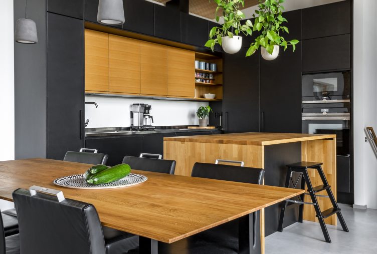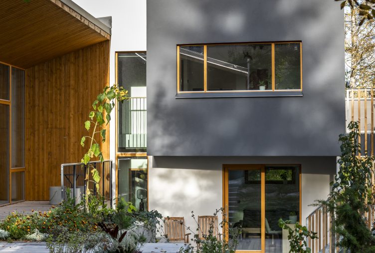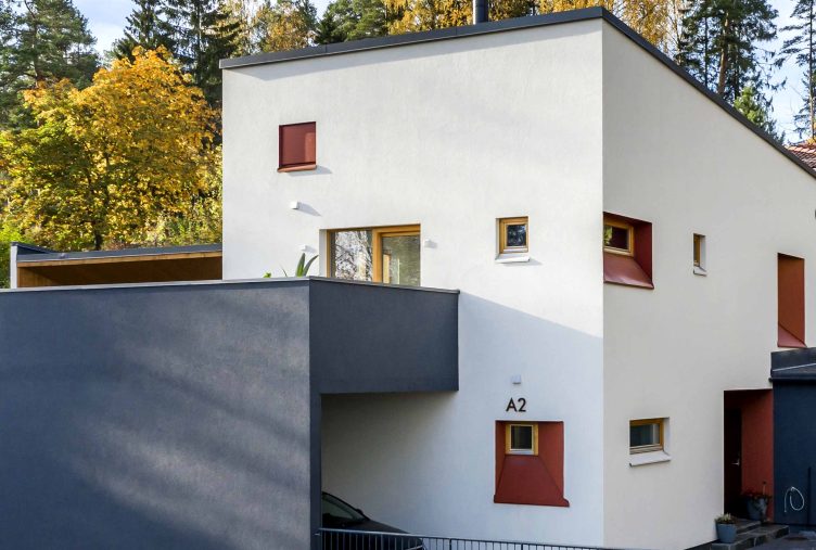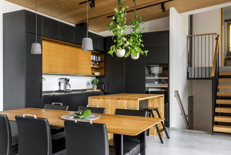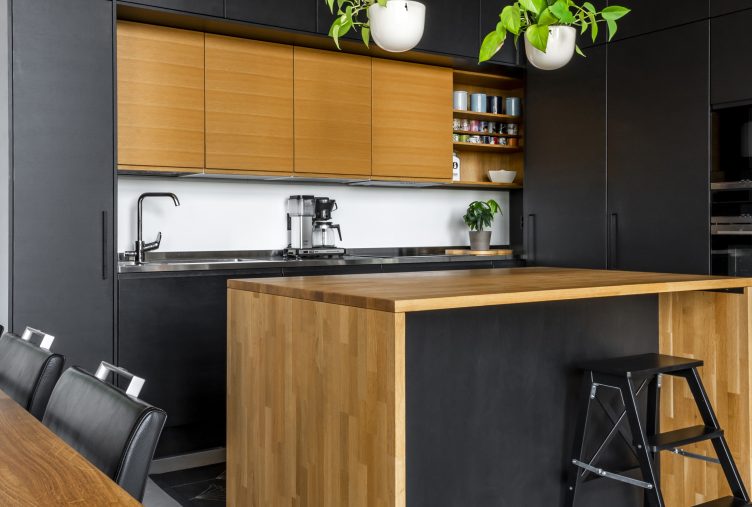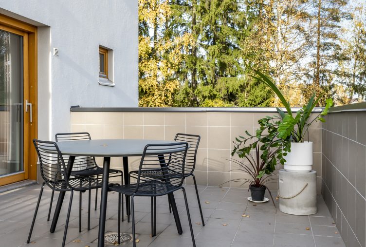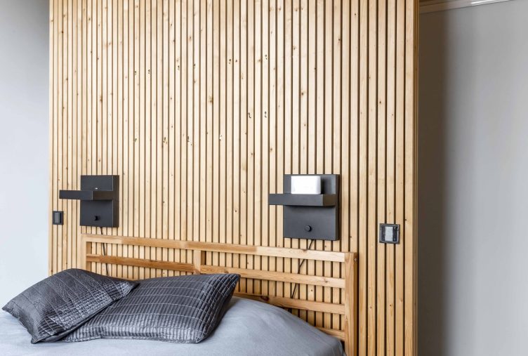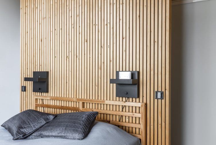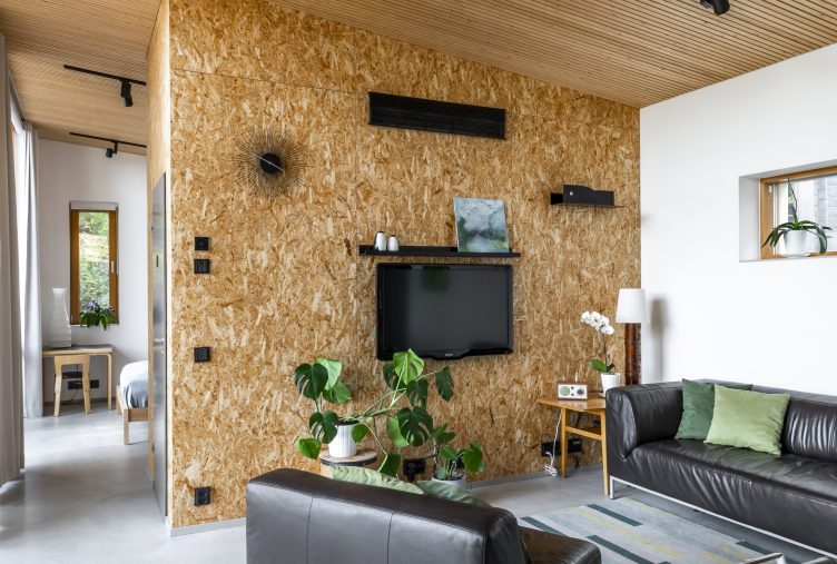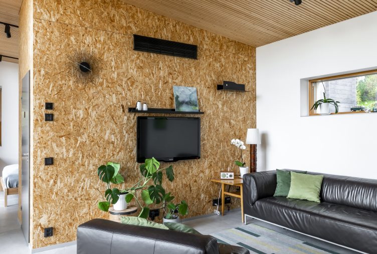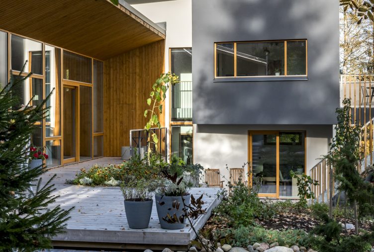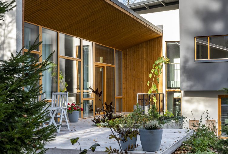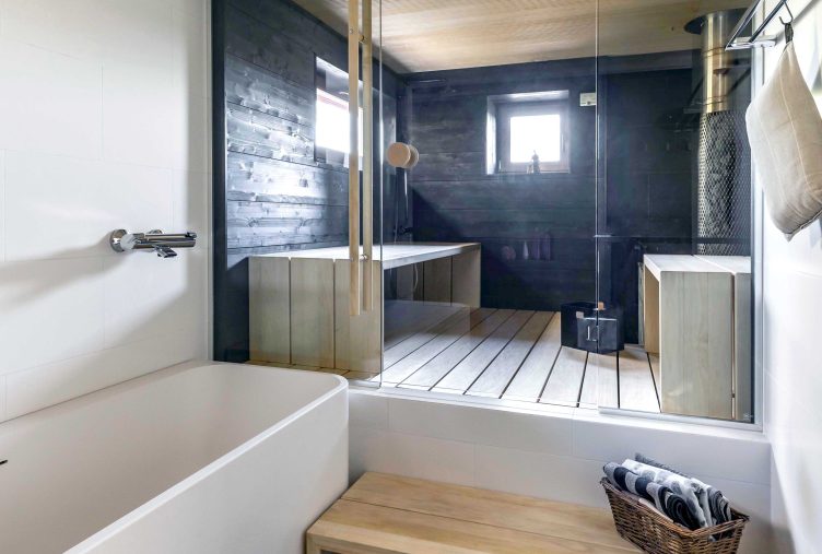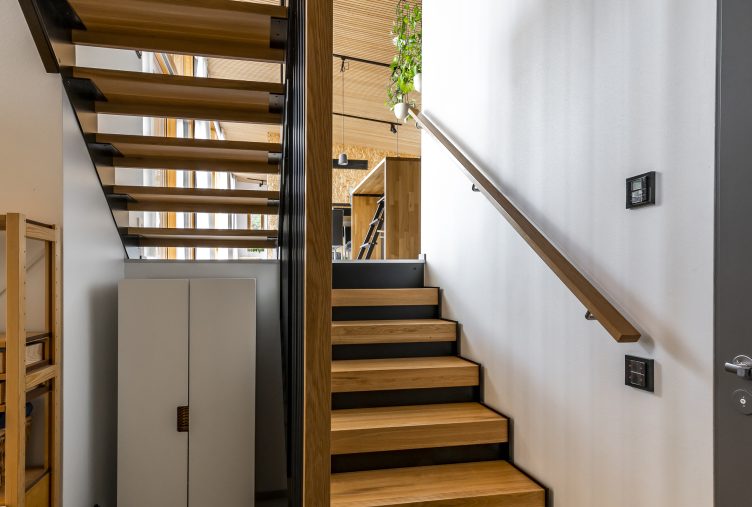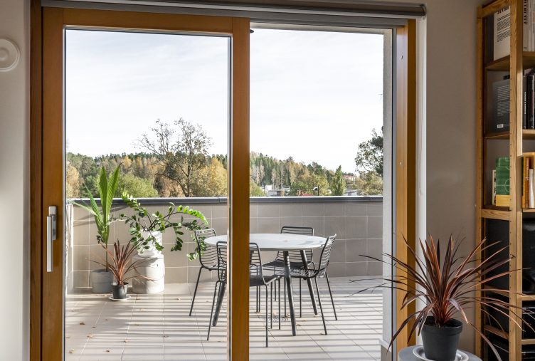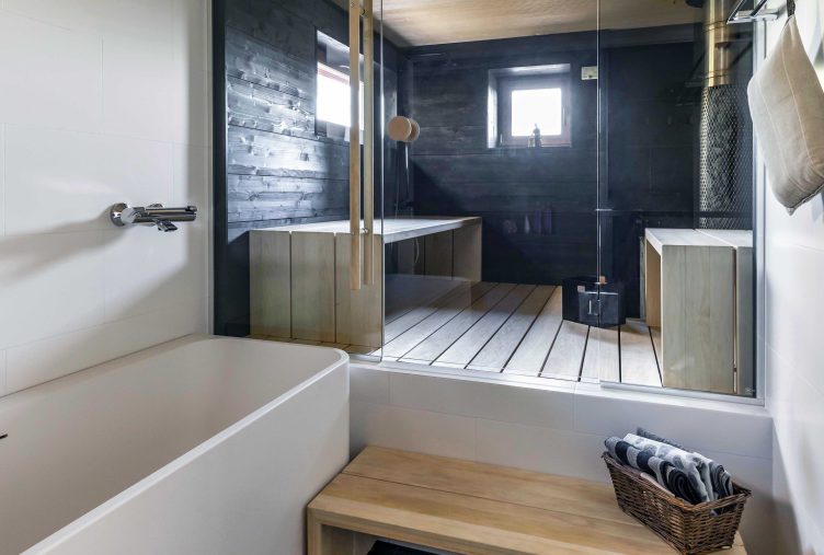 Sisätiloissa puun käyttö tuo lämpöä ja luo luonnollisen tunnelman, joka tasapainottaa muuten modernia ilmettä. Avara oleskelu- ja ruokailutila on suunniteltu perheen ja ystävien yhteisiä hetkiä varten, ja suuri terassi tuo ulkotilat osaksi arkea. Makuuhuoneet ja yksityisemmät tilat on sijoitettu harkiten, tarjoten rauhaa ja yksityisyyttä.