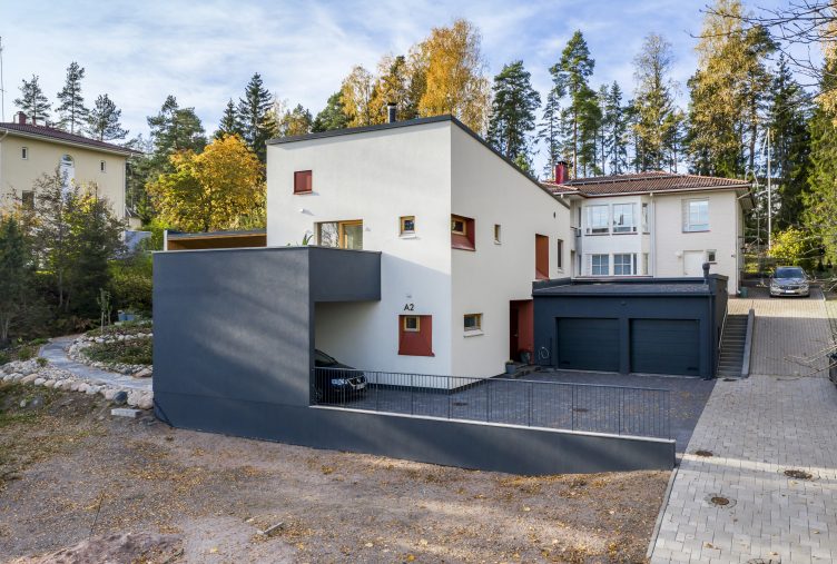 Jämerän kohde Espoon Saunalahdessa yhdistää modernin arkkitehtuurin ja luonnonläheisyyden harmoniseksi kokonaisuudeksi. Talon rohkea muotokieli ja minimalistinen design korostavat suuria ikkunoita, jotka avaavat näkymät vehreään ympäristöön ja täyttävät sisätilat luonnonvalolla.