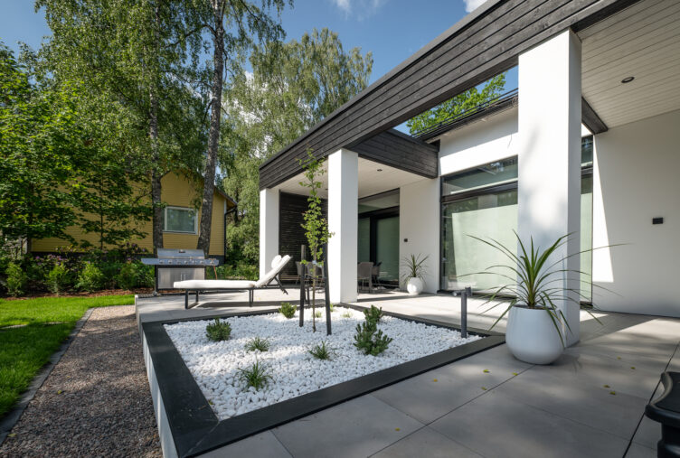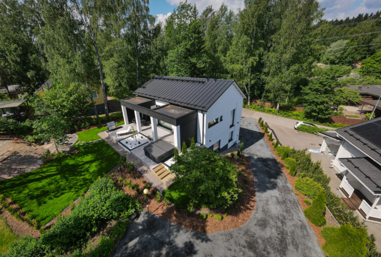Tämä moderni ja tyylikäs koti yhdistää avarat tilat ja toimivat ratkaisut. Yläkerrassa sijaitsevat oleskelu- ja ruokailutilat muodostavat kodin sydämen, yhdistyen saumattomasti keittiöön ja tilavalle terassille. Valoisa ja ilmava kokonaisuus luo viihtyisän tunnelman.