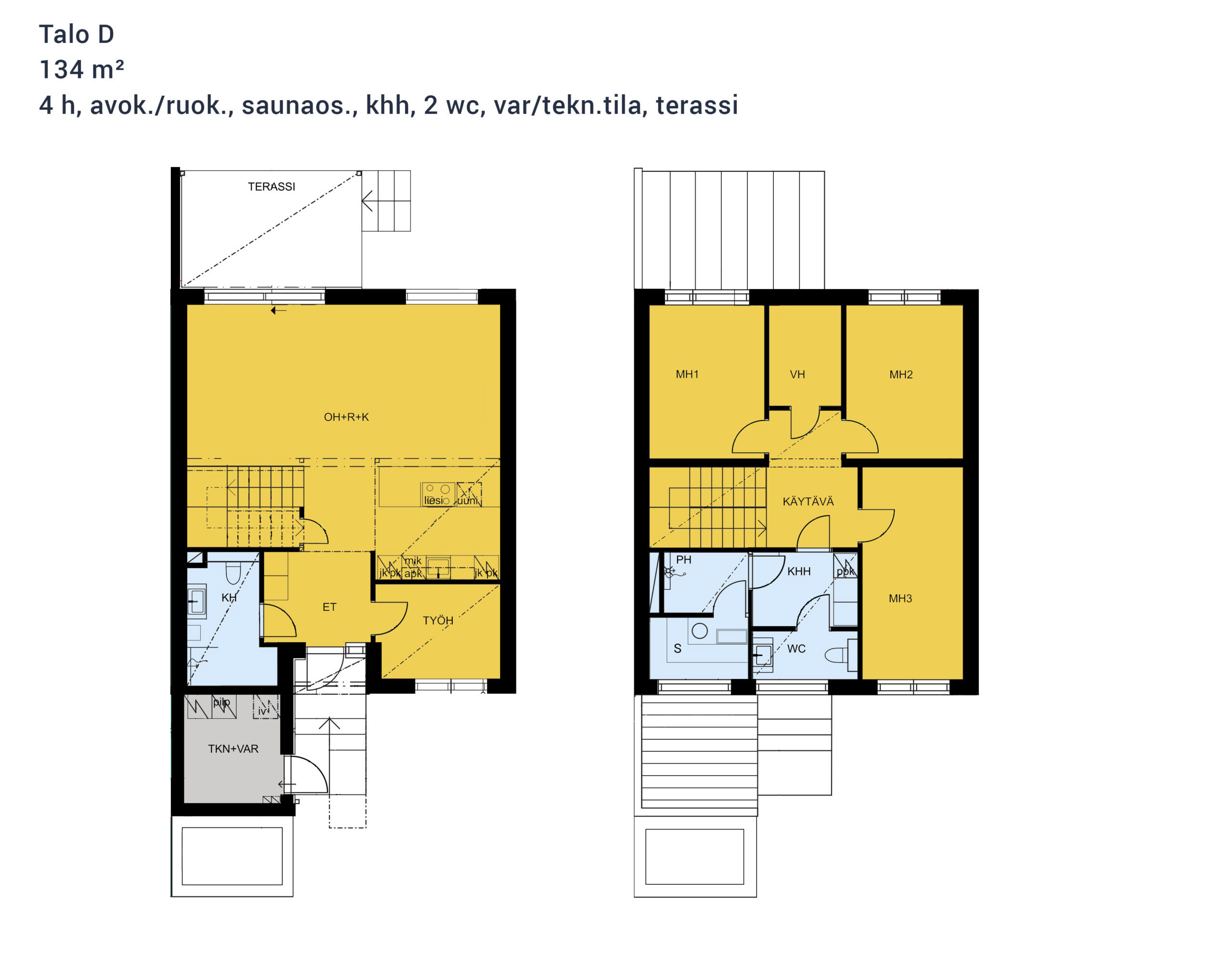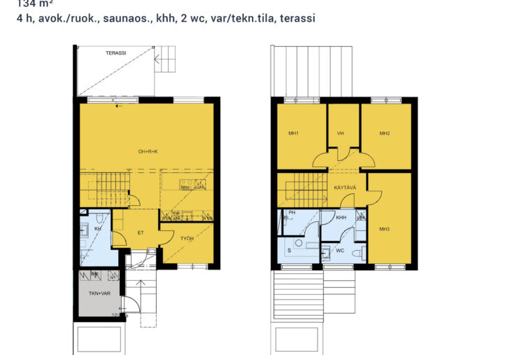 4 h, avok./ruok., saunaos., khh, 2 wc, var/tekn.tila, terassi