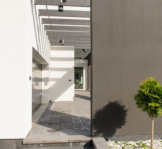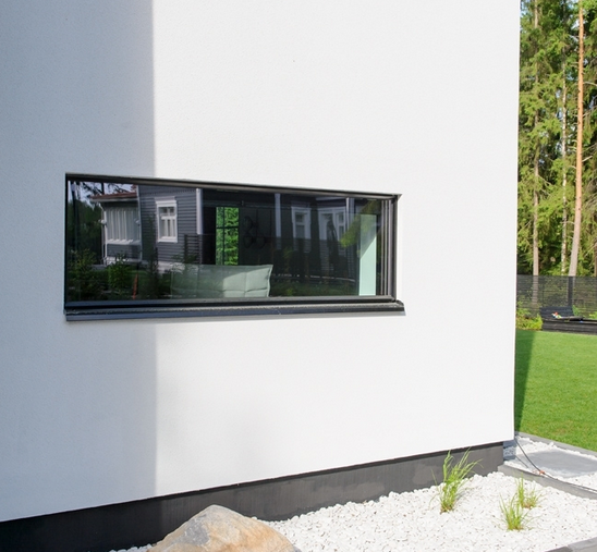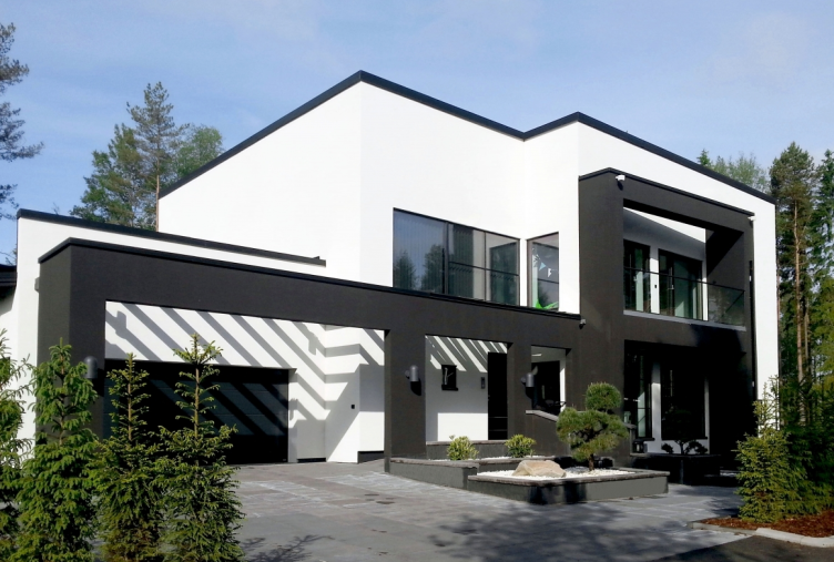 Suuret ikkunapinnat antavat valon virrata sisään, ja varjoleikkaukset luovat mielenkiintoisia efektejä julkisivuun. Sisäänkäynnin edustalla oleva kivipuutarha korostaa kodin modernia ilmettä, ja tilava terassi tarjoaa mukavan ympäristön ulkoilusta nauttimiseen.