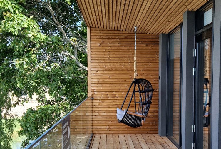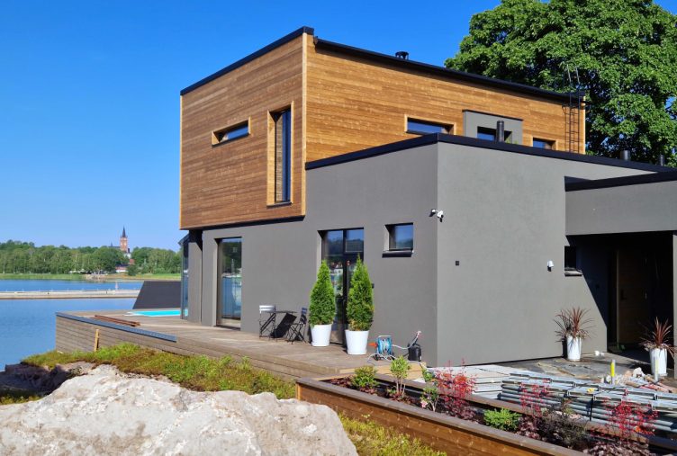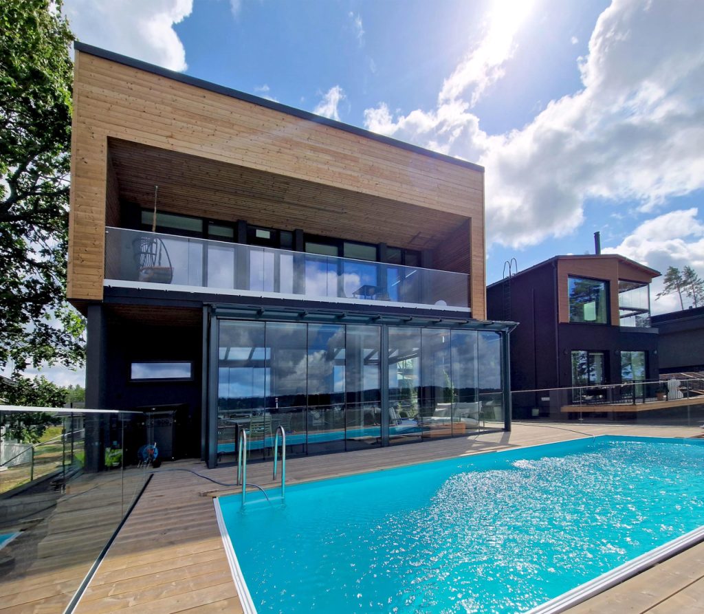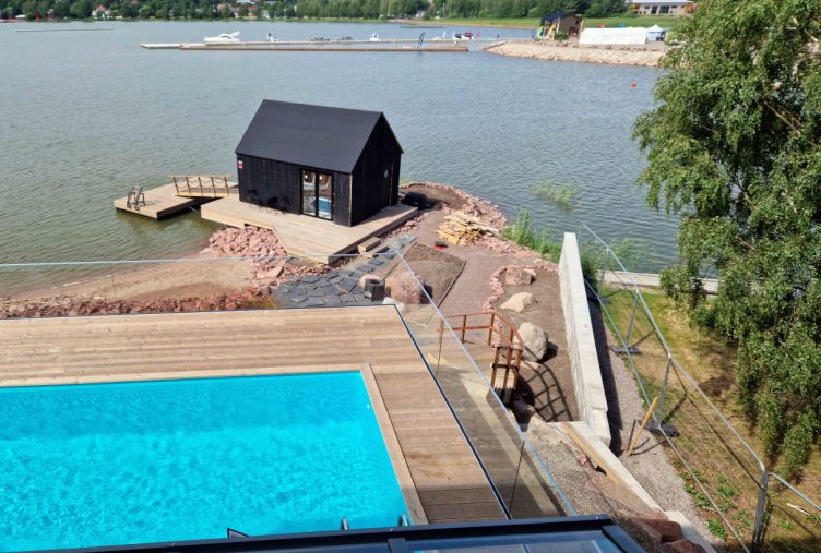 Talon edessä suuri terassi, johon on upotettu uima-allas ja rantaan sijoittuu noin 20:n neliön kokoinen venevaja sekä laituri.