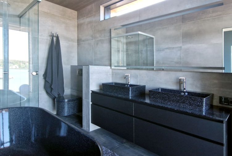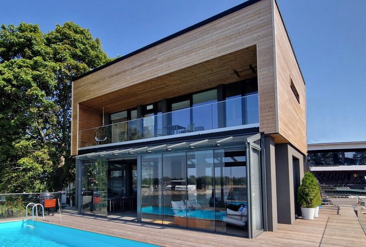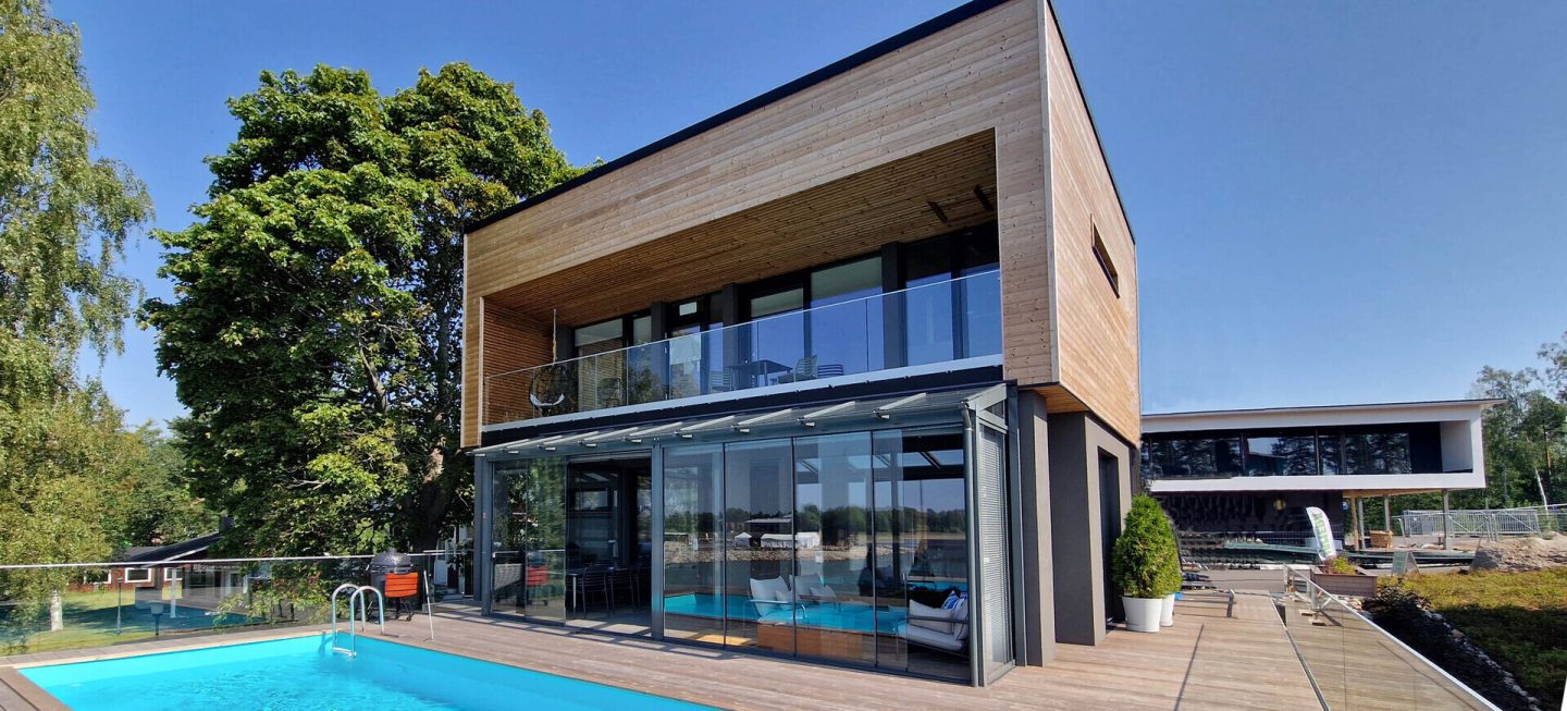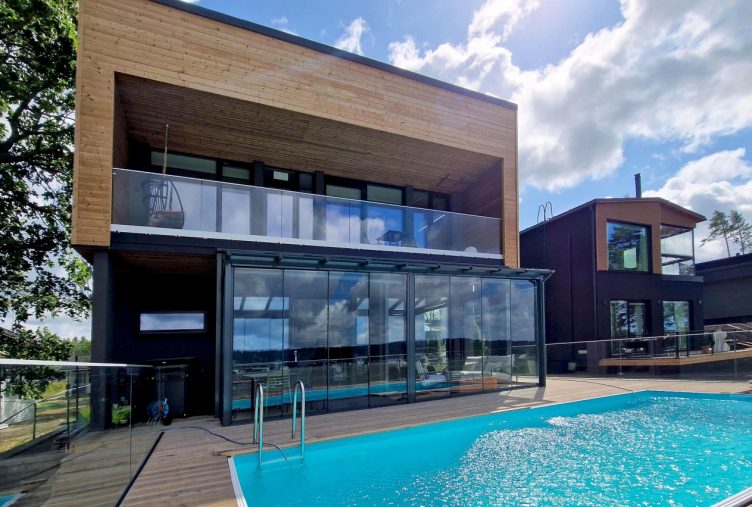 Talo sijaitsee merenrantatontilla ja sen jokaisesta asuinhuoneesta avautuvat näkymät merelle. Ensimmäisen kerroksen oleskelutilat jatkuvat talon levyisen ikkunaseinän ja liukuoven kautta terassille. Terassiin upotettu suuri uima-allas antaa kesäisin oman mielenkiintoisen valoefektinsä sisätiloihin. Makuuhuoneet ovat omassa rauhaan toisessa kerroksessa ja niiden yhteydessä on omat vaate- ja kylpyhuoneet, sekä käynti katetulle parvekkeelle. Päämakuuhuoneen yhteydessä on lisäksi erillinen työskentelyyn tarkoitettu rauhallinen tila.