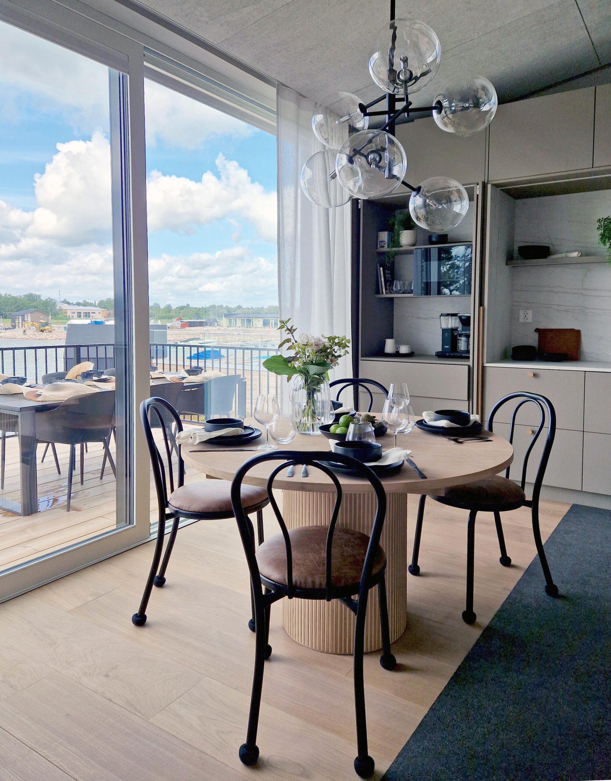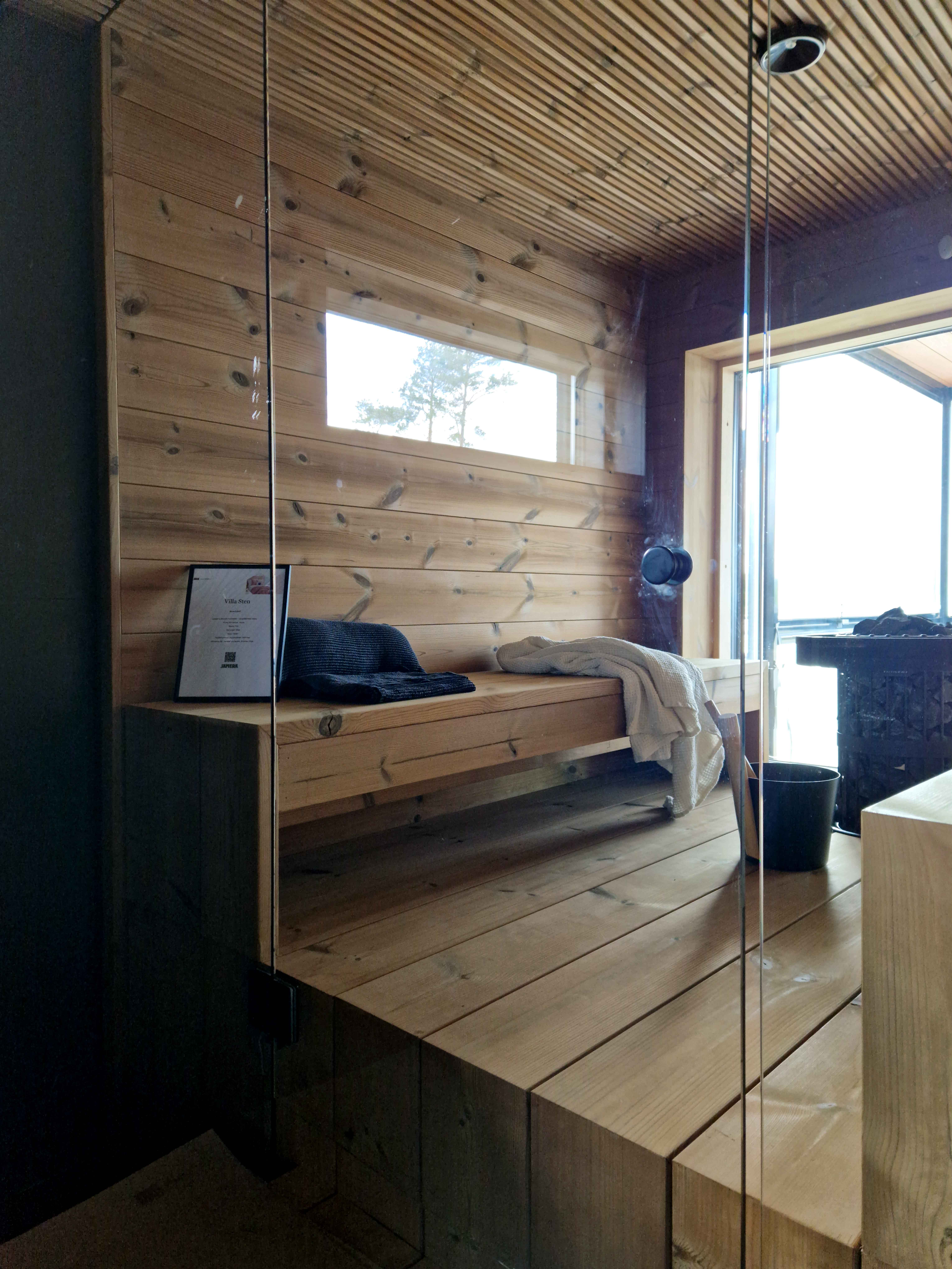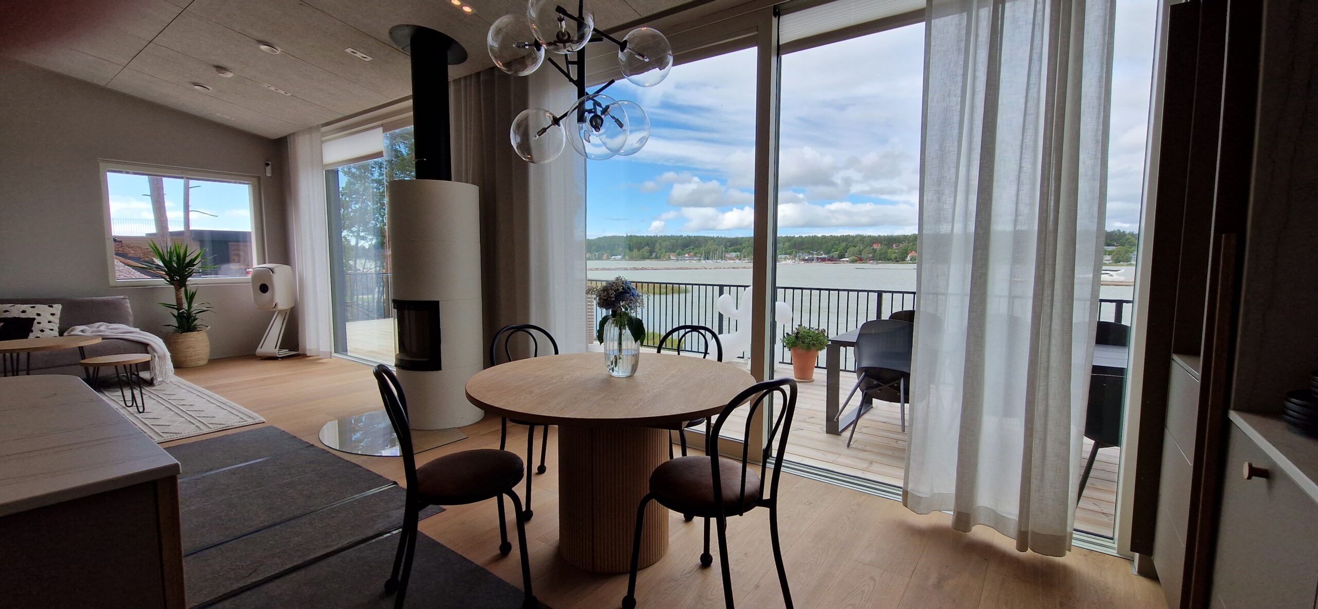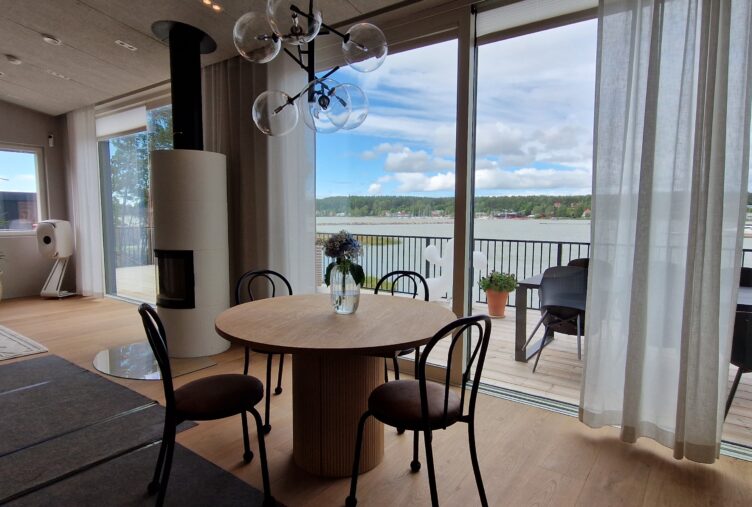Sisätilojen puupinnat ja tyylikkäät yksityiskohdat luovat lämpimän ja kodikkaan tunnelman, jossa moderni muotoilu kohtaa luonnolliset materiaalit. Kylpyhuone on suunniteltu rentouttavaksi tilaksi, jossa puupaneelit ja hillitty valaistus luovat spa-henkisen ilmapiirin. Ruokailutila avautuu suurelle terassille, joka tarjoaa upean paikan nauttia ulkoilmasta ja ympäröivistä näkymistä.