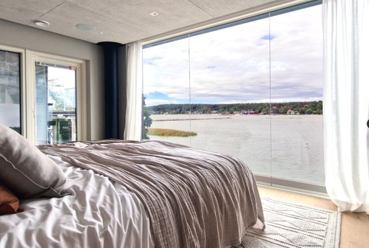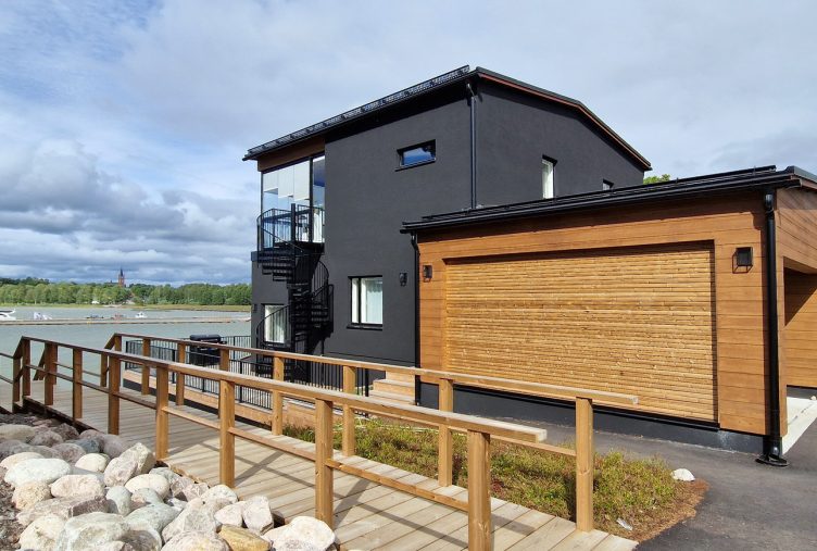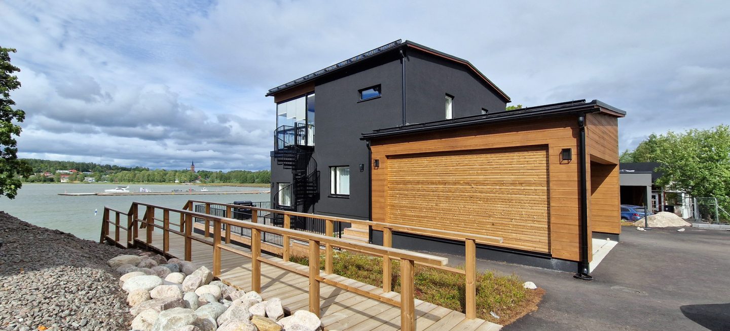 Rantatontilla sijaitsevasta talosta haluttiin mahdollisimman monesta tilasta näkymät merelle ja vastarannan kaupunkisilhuettiin. Heti taloon sisään tullessa avautuvat näkymät merelle ja muutaman askelman sisääntuloa alempana ovat oleskelutilat: avokeittiö, olohuone ja ruokailu. Tilassa on valoa, ilmavuutta ja jatkuvuutta: viisto sisäkatto, lattiapinnasta kattoon olevat ikkunat ja liukulasioven kautta pääsy talon levyiselle hulppealle terassille.