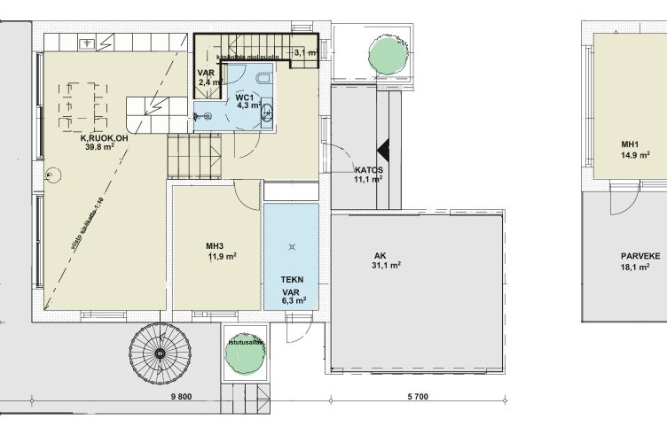 Talotekniikka: Vesi-ilmalämpöpumppu, vesikiertoinen lattialämmitys. Koneellinen tulo- ja poistoilmanvaihtojärjestelmä lämmöntalteenotolla